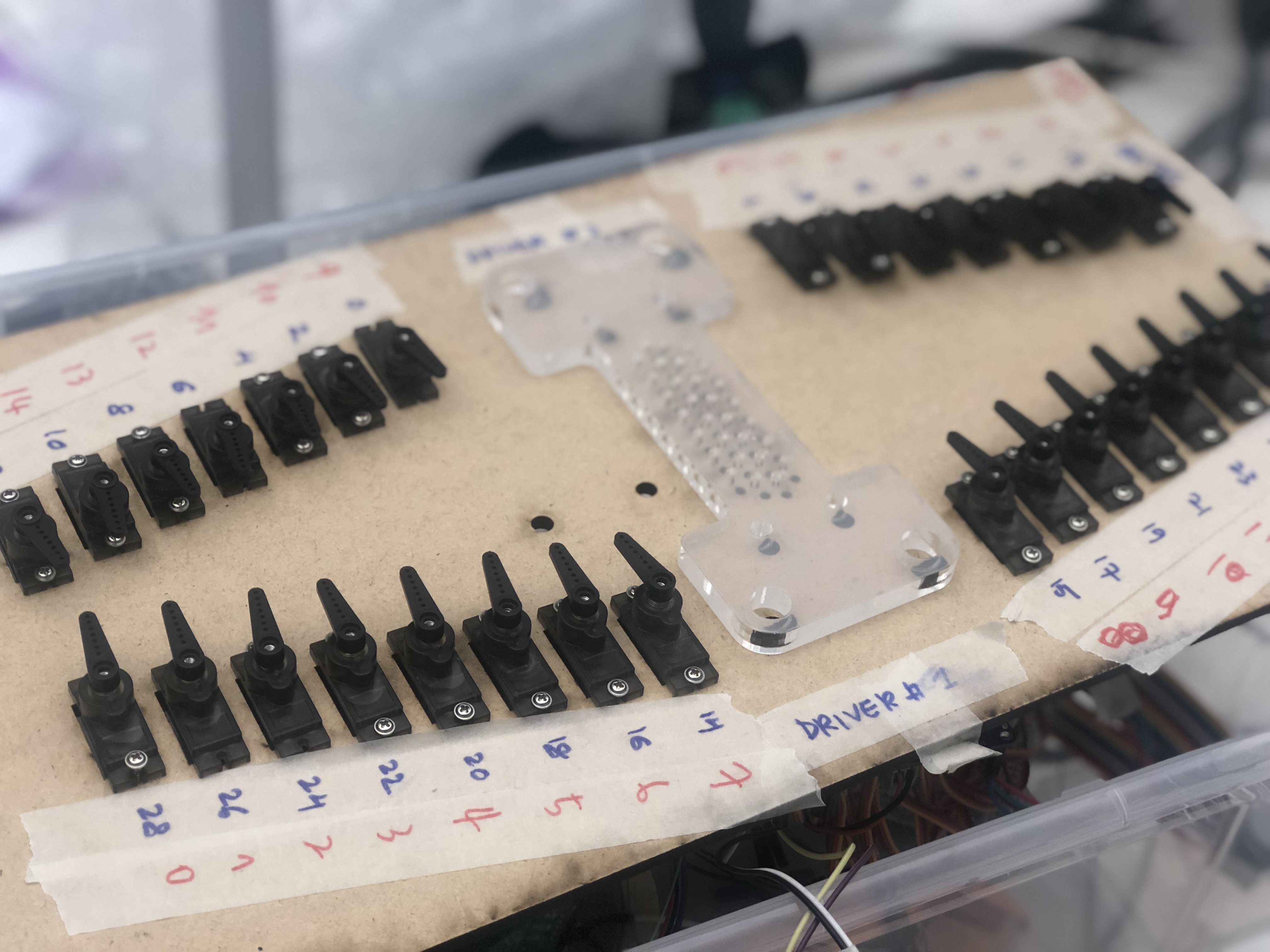 We used 30 servos that are connected with thin steel rod that open/closes the hole according to the result from the state machine. The 30 holes (As we used music box for 30 notes). The 30 holes are aligned into 3 rows (single rows are punched together) to speed up the punching speed. To do that we used Banggood's PCA9685 servo driver (I2C-bus controlled 16-channel pwm/servo controller) to stably run 30 servos (ideally) at the same time. The PCA9685 uses I2C bus to control 16 channel pwms, which requries only two signal pins (SDA/SDL) from arduino. If the address of the dirver are coded differently, we can chain up 62 drivers in max (then in theory, we can control 992 servos in total..!) This is the video clip that I'm testing PCA9685 controlling 30 servos at the same time (The max curren draw was around 5A peak. The punching module is driven with Brushless DC motor (7.6V / peak-current 10A )- later, we put later ESC driver for the safely reason.