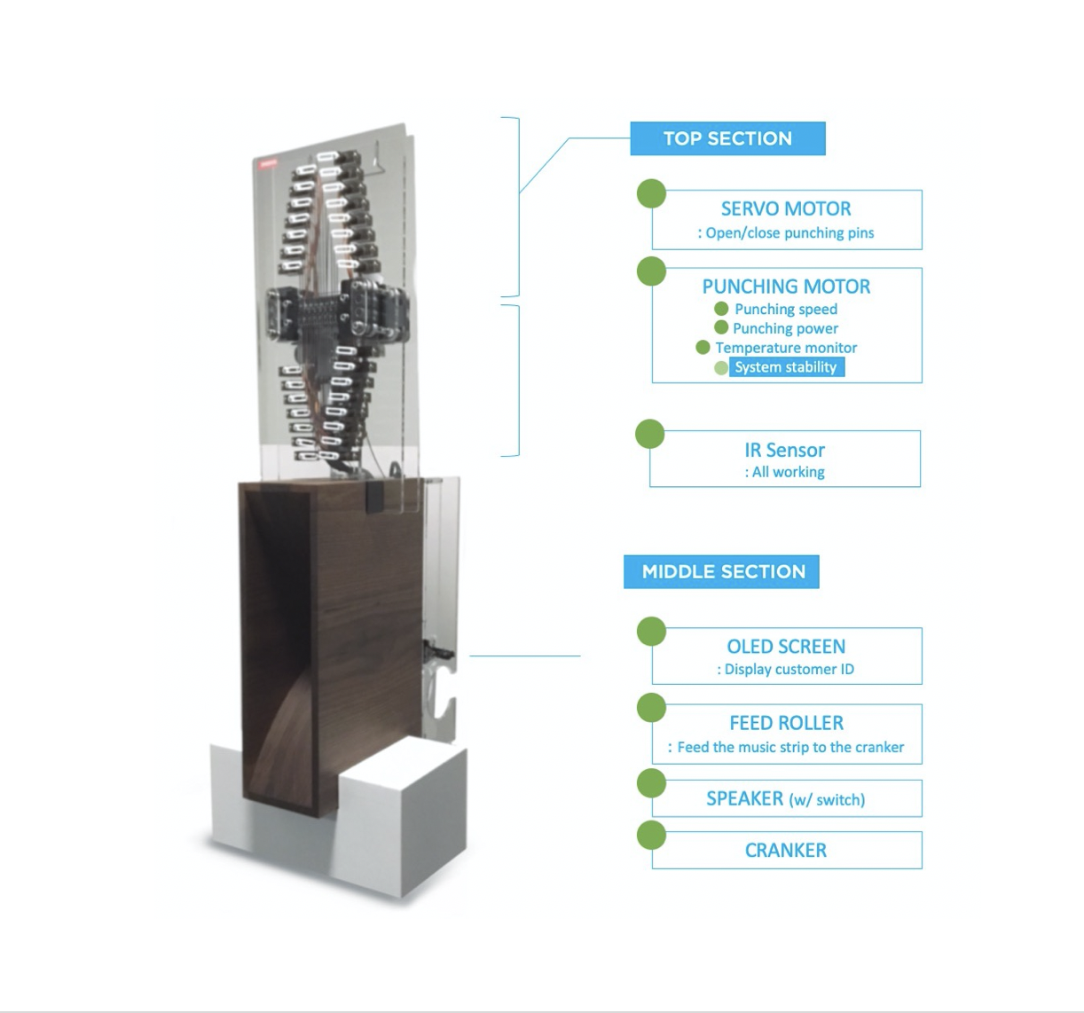 The bottom part of the machine includes the speaker that magnifiy the sound coming out from the automatic cranker attached to the backside of the wooden speaker. (Will be updated very soon)