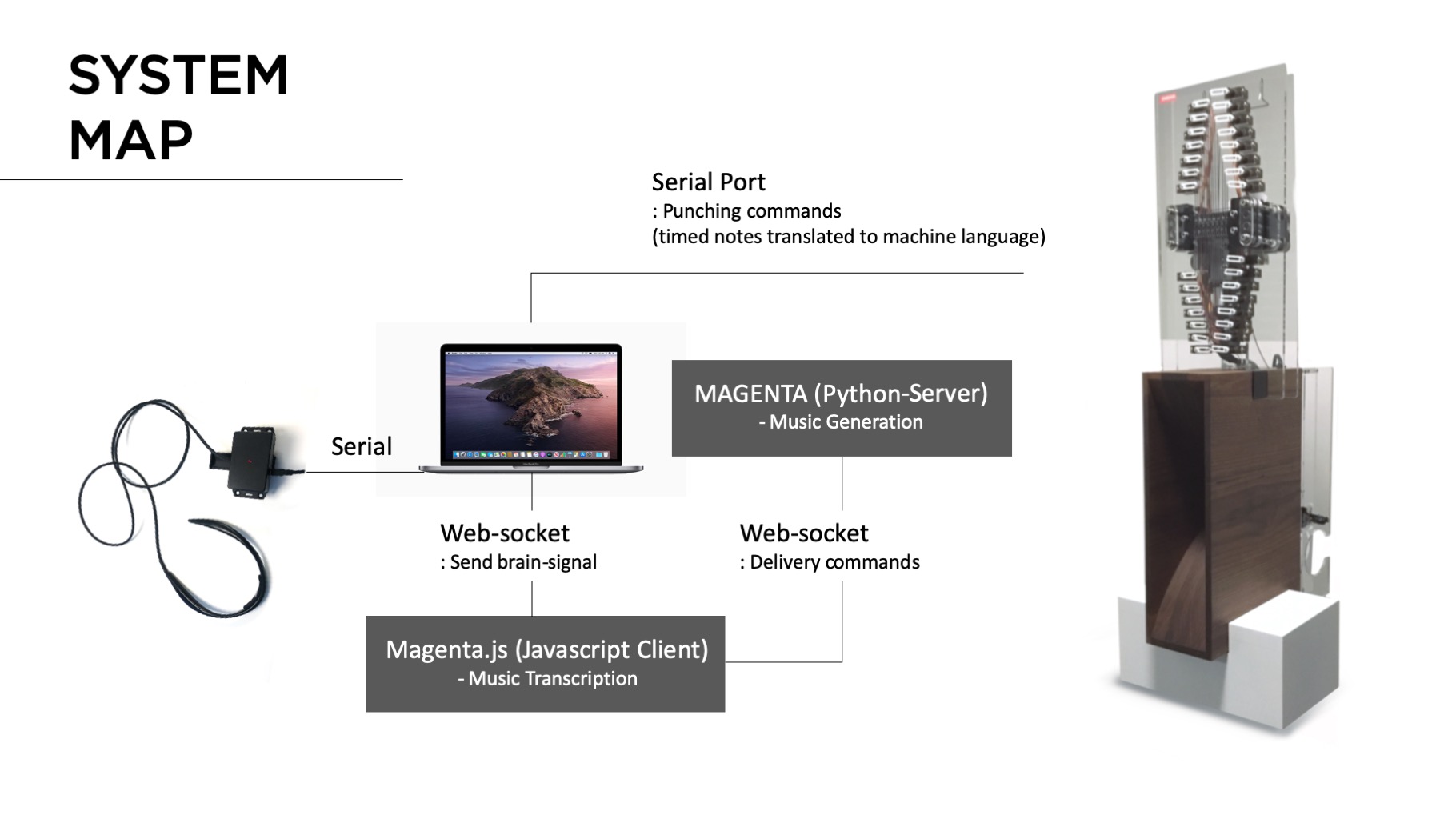 Environment : Magenta.js / Anime.js Google recently introduced Magenta.js, letting developers to easily make an web-based interface with Magenta backend.Numerous collective examples can be found from here. I specifically used Onsets and Frames to transcribe played midi input into music notes, and mm.Player for the playback. The brain signals (8 raw signals read from the device) hits the hidden web-midi piano in the webcanvas, and the resulting midi signals are transcribed accordingly. The transcribed signals then function as a motif-melody line for the music generation.