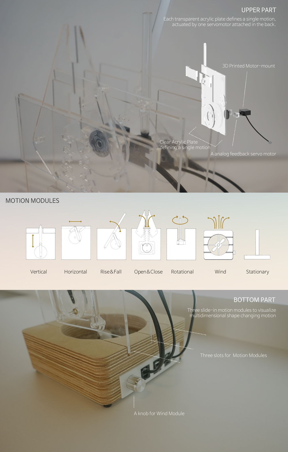 Each transparent acrylic plate defines a single motion, actuated by one servo motor attached to the back.