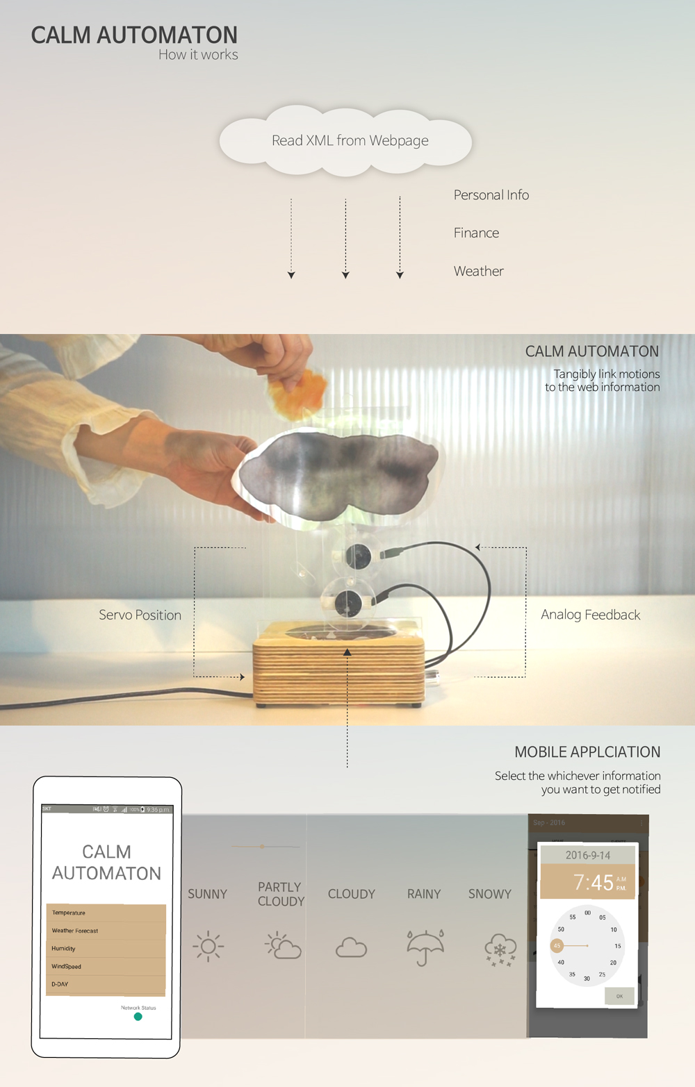 Calm Automaton is a user-customisable automaton toolkit that functions as an ambient display for peripheral information. It allows the user to be calmly notified of information changes with shape shifts of the Automaton. - Source : Proceedings of the 2017 CHI Conference Extended Abstracts on Human Factors in Computing Systems (https://dl.acm.org/citation.cfm?doid=3027063.3052968)